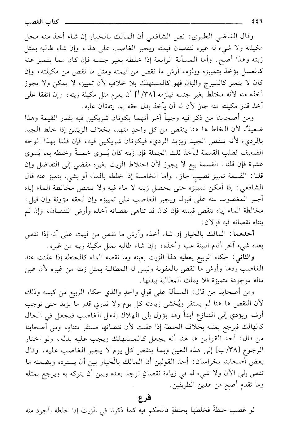 ومن أصحابنا من ذكر فيه وجهاً آخر أنهما يكونان شريكين فيه بقدر القيمة وهذا ضعيفٌ لأن الخلط ها هنا ينقص من كل واحد منهما بخلاف الزيتين إذا خلط الجيد بالرديء لأنه ينقص الجيد ويزيد الرديء فيكونان شريكين فيه، فإن قلنا بهذا الوجه الضعيف فطلبه القسمة ليأخذ ثلث الجملة فإن زيته كان يُسوى خمسةً وخلطه بما يُسوى عشرة فإن قلنا: القسمة بيع لا يجوز لأن اختلاط الزيت بغيره مفضي إلى التفاضل وإن قلنا: القسمة تمييز نصيبٍ جاز. وأما الخامسة إذا خلطه بالماء أو بشيء يتميز عنه قال الشافعي: إذا أمكن تمييزه حتى يحصل زيته لا ماء فيه ولا ينقص مخالطة الماء إياه أجبر المغصوب منه على قبوله ويجبر الغاصب على تمييزه وإن لحقه مؤونة وإن قيل: مخالطة الماء إياه تنقص قيمته فإن كان قد تناهى نقصانه أخذه وأرش النقصان، وإن لم يتناه نقصانه فيه قولان:
