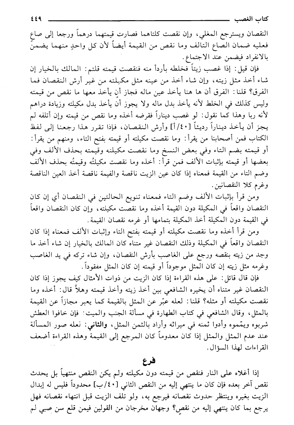 فإن قال قائل: على هذه القراءة إذا كان الزيت من ذوات الأمثال كيف يجوز إذا كان النقصان غير متناه أن يخيره الشافعي بين أخذ زيته وأخذ قيمته وهلاَّ قال: أخذه وما نقصت مكيلته أو مثله؟ قلنا: لعله عبّر عن المثل بالقيمة كما يعبر مجازاً عن القيمة بالمثل، وقال الشافعي في كتاب الطهارة في مسألة الجنب والميت: فإن خافوا العطش شربوه ويمّموه وأدوا ثمنه في ميراثه وأراد بالثمن المثل، والثاني: لعله صور المسألة عند عدم المثل والمثل إذا كان معدوماً كان المرجع إلى القيمة وهذه القراءة أضعف القراءات لهذا السؤال.