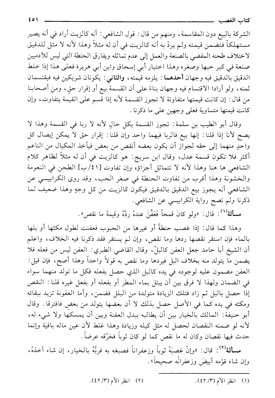 الشركة بالبيع دون المقاسمة، ومنهم من قال: قول الشافعي: أنه كالزيت أراد في أنه يصير مستهلكاً فتضمن قيمته ولم يرد به أنه كالزيت في أن له مثلاً وهذا لأنه لا مثل للدقيق لاختلاف طحنه المفضي بالصنعة والعمل إلى عدم تماثله ويفارق الحنطة التي ليس للآدميين صنعة في كبر حبها وصغره وهذا اختيار أبي إسحاق وابن أبي هريرة فعلى هذا إذا خلط الدقيق بالدقيق فيه وجهان أحدهما: يلزمه قيمته، والثاني: يكونان شريكين فيه فيقتسمان ثمنه، ولو أرادا الاقتسام فيه وجهان بناءً على أن القسمة بيع أو إقرار حقٍ، ومن أصحابنا من قال: إن كانت قيمتها متفاوتة لا تجوز القسمة لأنه إذا قسم على القيمة يتفاوت، وإن كانت قيمتها متساوية فعلى وجهين على ما ذكرنا.