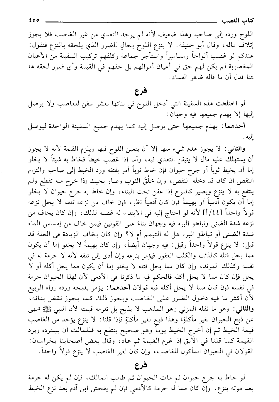 والثاني: لا يجوز هدم شيء منها إلا أن يتعين اللوح فيها ويلزم القيمة لأنه لا يجوز أن يستهلك عليه مال لا يتيقن التعدي فيه، وأما إذا غصب خيطاً فخاط به شيئاً لا يخلو إما أن يخيط ثوباً أو جرح حيوان فإن خاط ثوباً أمر بفتقه ورد الخيط إلى صاحبه والتزام النقص إن كان قد دخله النقص، وإن خُلقَ الثوب وصار بحيث إذا خرج منه تقطع ولم ينتفع به لا ينزع ويصير كاللوح إذا عفن تحت البناء، وإن خاط به جرح حيوان لا يخلو إما أن يكون آدمياً أو بهيمةً فإن كان آدمياً نظر، فإن خاف من نزعه تلفه لا يحل نزعه قولاً واحداً [44/أ] لأنه لو احتاج إليه في الابتداء له غصبه لذلك، وإن كان يخاف من نزعه شدة الضنى وتباطؤ البرء فيه وجهان بناءً على القولين فيمن خاف من إمساس الماء شدة الضنى أو تباطؤ البرء هل له التيمم أم لا؟ وإن كان يخاف الزيادة في العلة قد قيل: لا ينزع قولاً واحداً وقيل: فيه وجهان أيضاً، وإن كان بهيمةً لا يخلو إما أن يكون مما يحل قتله كالذئب والكلب العقور فيؤمر بنزعه وإن أدى إلى تلفه لأنه لا حرمة له في نفسه وكذلك المرتد، وإن كان مما يحل قتله لا يخلو إما أن يكون مما يحل أكله أو لا يحل فإن كان مما لا يحل أكله فالحكم فيه ما ذكرنا في الآدمي لأن لهذاا الحيوان حرمة في نفسه فإن كان مما لا يحل أكله فيه قولان أحدهما: يؤمو بذبحه ورده رواه الربيع لأن أكثر ما فيه دخول الضرر على الغاصب ويجوز ذلك كما يجوز نقض بنائه، والثاني: وهو ما نقله المزني وهو المذهب لا يذبح بل تلزمه قيمته لأن النبي - صلى الله عليه وسلم - "نهى عن ذبح الحيوان لغير مأكلةٍ" وهذا ذبح لغير مأكلةٍ فإذا قلنا: لا ينزع يؤخذ من الغاصب قيمة الخيط ثم إن أخرج الخيط يوماً وهو صحيح ينتفع به فللمالك أن يسترده ويرد القيمة كما قلنا في الآبق إذا غرم القيمة ثم عاد، وقال بعض أصحابنا بخراسان: القولان في الحيوان المأكول للغاصب، وإن كان لغير الغاصب لا ينزع قولاً واحداً.