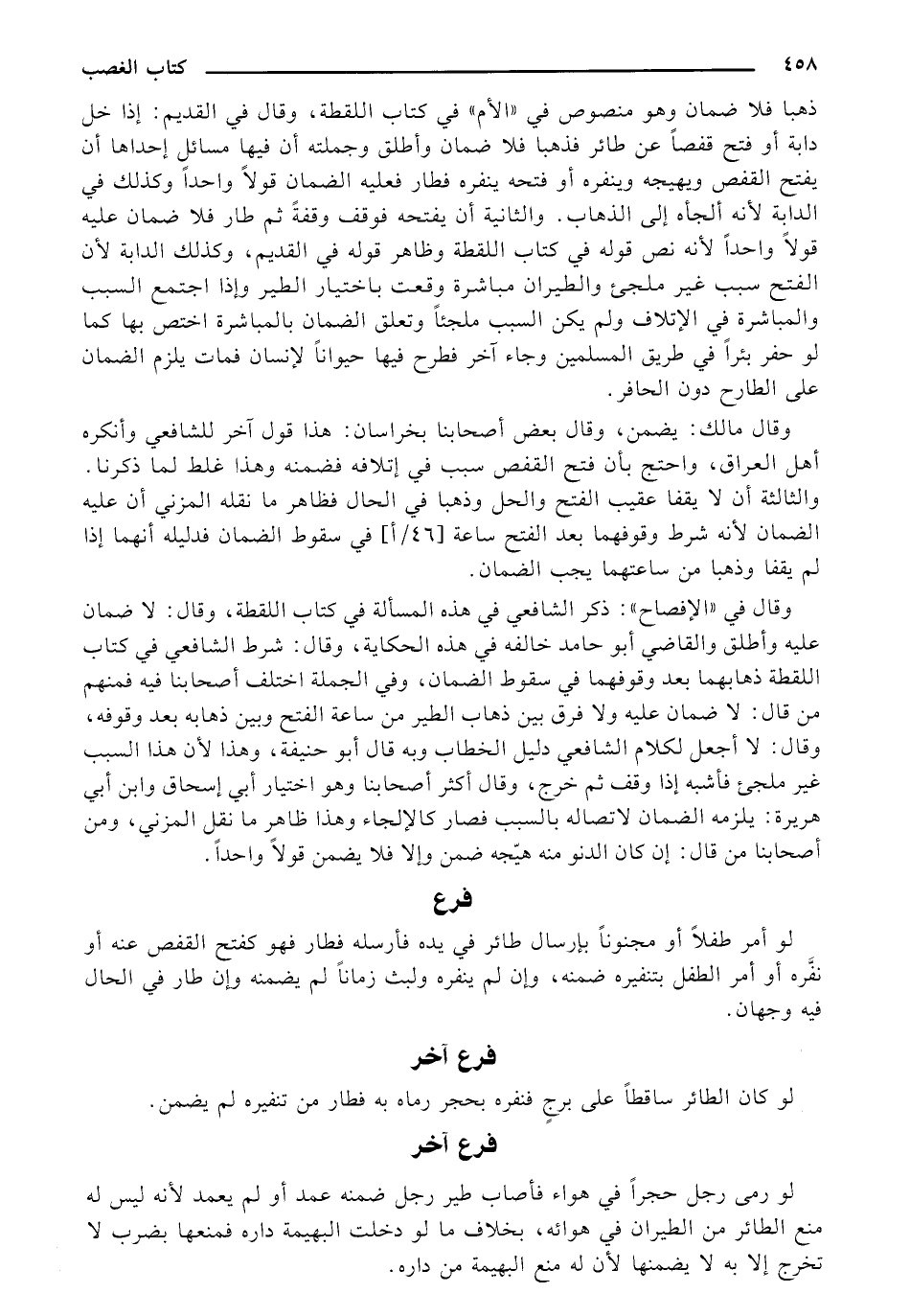 ذهبا فلا ضمان وهو منصوص في "الأم" في كتاب اللقطة، وقال في القديم: إذا خل دابة أو فتح قفصاً عن طائر فذهبا فلا ضمان وأطلق وجملته أن فيها مسائل إحداها أن يفتح القفص ويهيجه وينفره أو فتحه ينفره فطار فعليه الضمان قولا واحداً وكذلك في الدابة لأنه ألجأه إلى الذهاب. والثانية أن يفتحه فوقف وقفة ثم طار فلا ضمان عليه قولاً واحداً لأنه نص قوله في كتاب اللقطة وظاهر قوله في القديم، وكذلك الدابة لأن الفتح سبب غير ملجئ والطيران مباشرة وقعت باختيار الطير وإذا اجتمع السبب والمباشرة في الإتلاف ولم يكن السبب ملجئاً وتعلق الضمان بالمباشرة اختص بها كما لو حفر بئراً في طريق المسلمين وجاء أخر فطرح فيها حيواناً لإنسان فمات يلزم الضمان على الطارح دون الحافر.