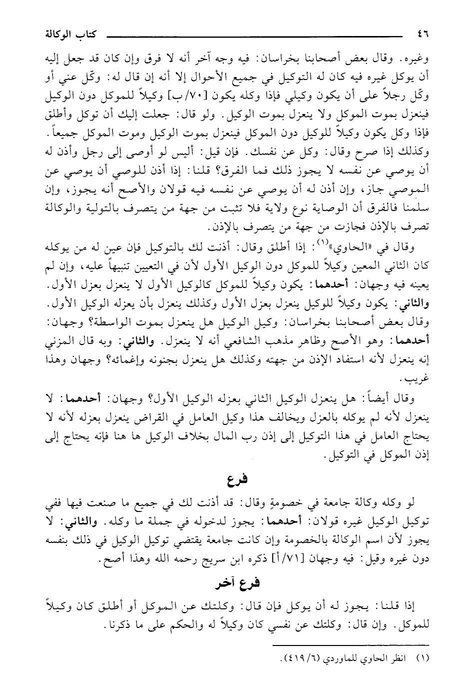 وقال أيضًا: هل ينعزل الوكيل الثاني بعزله الوكيل الأول؟ وجهان: أحدهما: لا ينعزل لأنه لم يوكله بالعزل ويخالف هذا وكيل العامل في القراض ينعزل بعزله لأنه لا يحتاج العامل في هذا التوكيل إلى إذن رب المال بخلاف الوكيل ها هنا فإنه يحتاج إلى إذن الموكل في التوكيل.