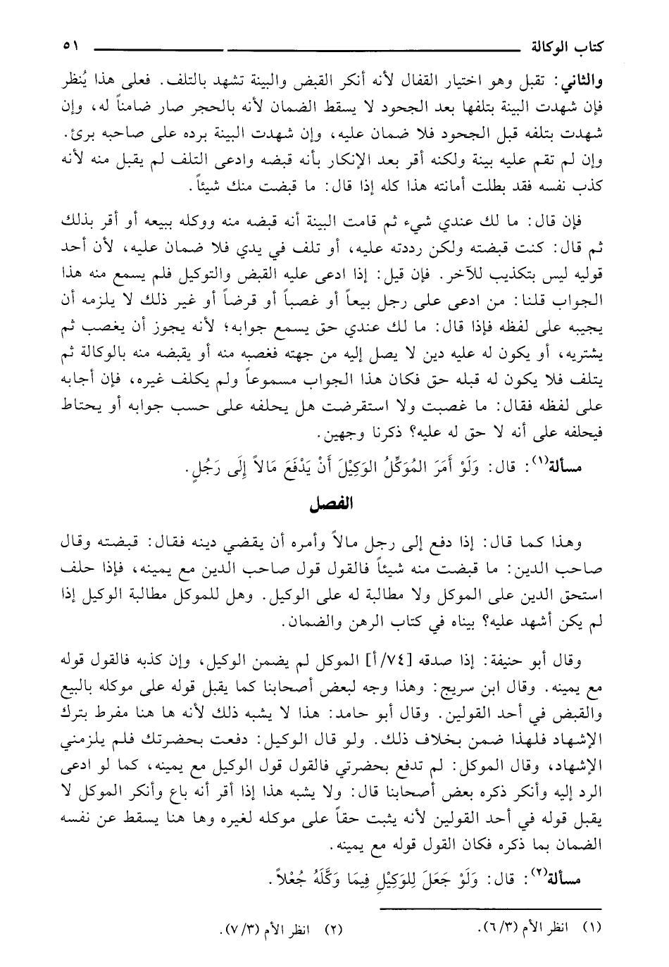 فإن قال: ما لك عندي شيء ثم قامت البينة أنه قبضه منه ووكله ببيعه أو أقر بذلك ثم قال: كنت قبضته ولكن رددته عليه، أو تلف في يدي فلا ضمان عليه، لأن أحد قوليه ليس بتكذيب للأخر. فإن قيل: إذا ادعى عليه القبض والتوكيل فلم يسمع منه هذا الجواب قلنا: من ادعى على رجل بيعًا أو غصبًا أو قرضًا أو غير ذلك لا يلزم أن يجيبه على لفظه فإذا قال: ما لك عندي حق يسمع جوابه؟ لأنه يجوز أن يخب ثم يشتريه، أو يكون له عليه دين لا يصل إليه من جهته فغصبه منه أو يقبضه منه بالوكالة ثم يتلف فلا يكون له قبله حق فكان هذا الجواب مسموعًا ولم يكلف غيره، فإن أجابه على لفظه فقال: ما غصبت ولا استقرضت هل يحلفه على حسب جوابه أو يحتاط فيحلفه على أنه لا حق له عليه؟ ذكرنا وجهين.