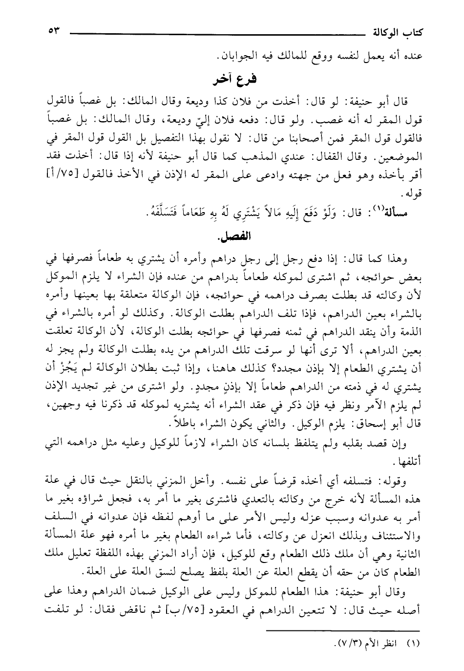 وقوله: فتسلفه أي أخذه قرضا على نفسه. وأخل المزني بالنقل حيث قال في علة هذه المسألة لأنه خرج من وكالته بالتعدي فاشترى بغير ما أمر به، فجعل شراؤه بغير ما أمر به عدوانه وسبب عزله وليس الأمر على ما أوهم لفظه فإن عدوانه في السلف والاستئناف وبذلك انعزل عن وكالته، فأما ثراءه الطعام بغير ما أمره فهو علة المسألة الثانية وهي أن ملك ذلك الطعام وقع للوكيل، فإن أراد المزني بهذه اللفظة تعليل ملك الطعام كان من حقه أن يقطع العلة عن العلة بلفظ يصلح لنسق العلة على العلة.