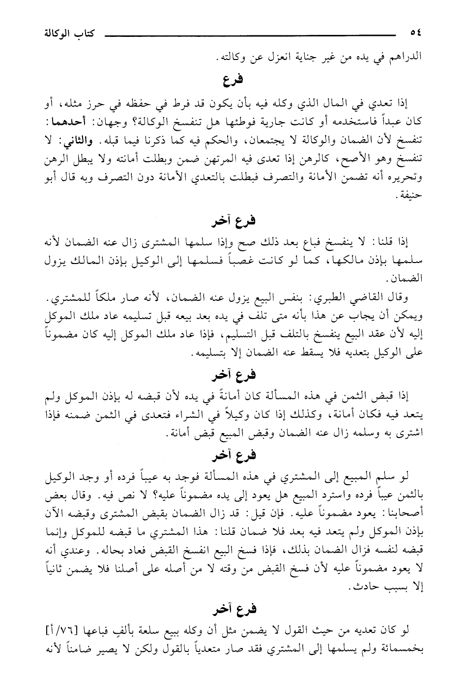 إذا تعدي في المال الذي وكله فيه بأن يكون قد فرط في حفظه في حرز مثله، أو كان عبئاً فاستخدمه أو كانت جارية فوطئها هل تنفسخ الوكالة؟ وجهان: أحدهما: تنفسخ لأن الضمان والوكالة لا يجتمعان، والحكم فيه كما ذكرنا فيما قبله. والثاني: لا تنفسخ وهو الأصح، كالرهن إذا تعدى فيه المرتهن ضمن وبطلت أمانته ولا يبطل الرهن وتحريره أنه تضمن الأمانة والتصرف فبطلت بالتعدي الأمانة دون التصرف وبه قال أبو حنيفة.