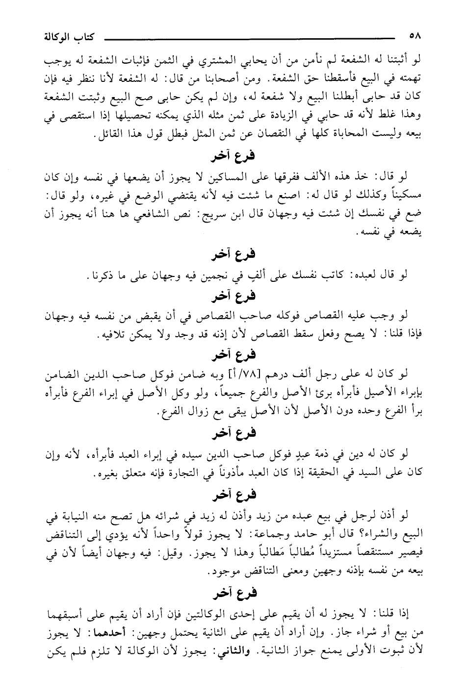 لو أذن لرجل في بيع عبده من زيد وأذن له زيد في شرائه هل تصح منه النيابة في البيع والشراء؟ قال أبو حامد وجماعة: لا يجوز قولًا واحدًا لأنه يؤدي إلى التناقض فيصير مستنقصًا مستزيدًا مطالبًا مطالبًا وهذا لا يجوز. وقيل: فيه وجهان أيضًا لأن في بيعه من نفسه بإذنه وجهين ومعنى التناقض موجود.