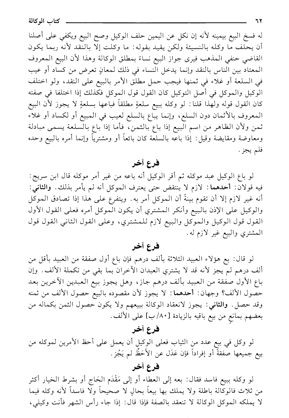 لو وكل في بيع عدد من الثياب فعلى الوكيل أن يعمل على أحظ الأمرين لموكله من بيع جميعها صفقًة أو إفرادًا فإن عَدَل عن الأَحَظِّ لم يجز.