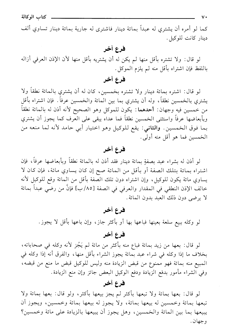 لو أذن له بشراء عبد بصفٍة بمائة دينار فقد أذن له بالمائة نطقًا وبأبعاضها عرفًا، فإن اشتراه بمائة بتلك الصفة أو بأقل من المائة صح إن كان يساوي مائة، فإن كان لا يساوي مائة يكون للوكيل، وإن اشتراه دون تلك الصفة بأقل من المائة وقع للوكيل لأنه خالف الإذن النطقي في المقدار والعرفي في الصفة [85/ ب] فإن من رضي عبدًا بمائة لا يرضى دون ذلك العبد بدون المائة.