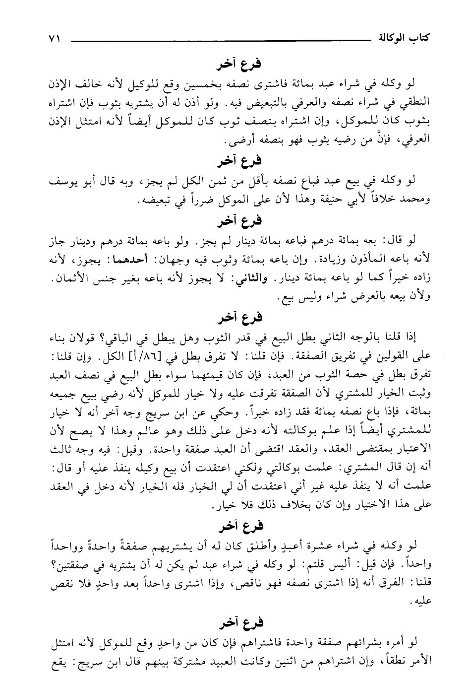 لو وكله في شراء عشرة أعبٍد وأطلق كان له أن يشتريهم صفقًة واحدًة وواحدًا واحداً. فإن قيل: أليس قلتم: لو وكله في شراء عبد لم يكن له أن يشتريه في صفقتين؟ قلنا: الفرق أنه إذا اشترى نصفه فهو ناقص، وإذا اشترى واحدًا بعد واحد فلا نقص عليه.