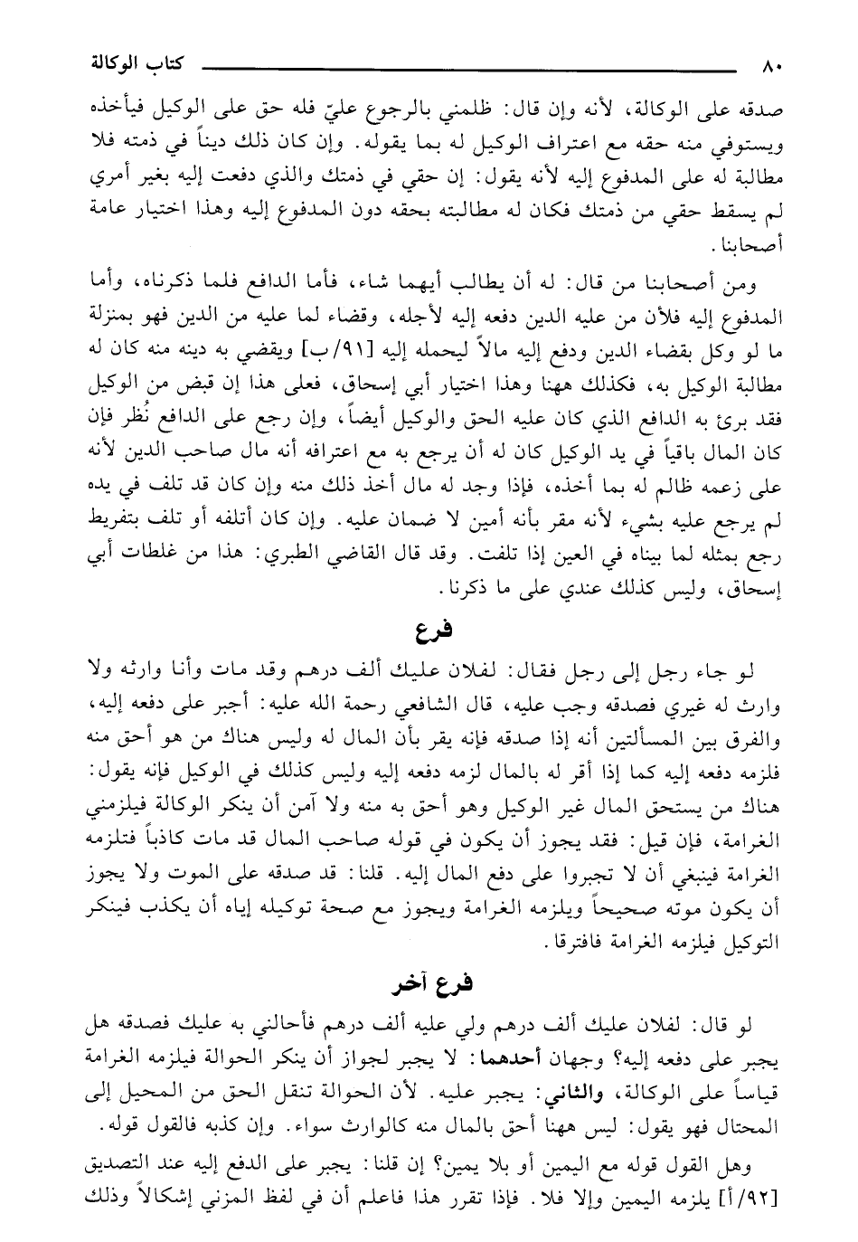 لو جاء رجل إلى رجل فقال: لفلان عليك ألف درهم وقد مات وأنا وارثه ولا وارث له غيري فصدقه وجب عليه، قال الشافعي رحمة الله عليه: أجبر على دفعه إليه، والفرق بين المسألتين أنه إذا صدقه فإنه يقر بأن المال له وليس هناك من هو أحق منه فلزمه دفعه إليه كما إذا أقر له بالمال لزمه دفعه إليه وليس كذلك في الوكيل فإنه يقول: هناك من يستحق المال غير الوكيل وهو أحق به منه ولا أمن أن ينكر الوكالة فيلزمني الغرامة، فإن قيل: فقد يجوز أن يكون في قوله صاحب المال قد مات كاذبًا فتلزمه الغرامة فينبغي أن لا تجبروا على دفع المال إليه. قلنا: قد صدقه على الموت ولا يجوز أن يكون موته صحيحًا ويلزمه الغرامة ويجوز مع صحة توكيله إياه أن يكذب فينكر التوكيل فيلزمه الغرامة فافترقا.