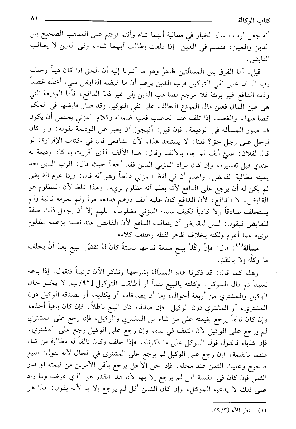وهذا كما قال: قد ذكرنا هذه المسألة بشرحها ونذكر الآن ترتيباً فنقول: إذا باعه نسيائً ثم قال الموكل: وكلته بالبيع نقداً أو أطلقت التوكيل [92/ب] لا يخلو حال الوكيل والمشتري من أربعة أحوال، إما أن يصدقاه، أو يكذبه، أو يصدقه الوكيل دون المشتري، أو المشتري دون الوكيل. فإن صدقاه كان البيع باطلاً، فإن كان باقياً أخذه، وان كان تالفاً يرجع بقيمته على من شاء من المشتري والوكيل، فإن رجع على المشتري لم يرجع على الوكيل لأن التلف في يده، وان رجع على الوكيل رجع على المشتري. فإن كذباه فالقول قول الموكل على ما ذكرناه، فإذا حلف وكان تالفاً له مطالبة من شاء منهما بالقيمة، فإن رجع على الوكيل لم يرجع على المشتري في الحال لأنه يقول: البيع صحيح وعليك الثمن عند محله، فإذا حل الأجل يرجع بأقل الأمرين من قيمته أو قدر الثمن فإن كان في القيمة أقل لم يرجع إلا بها لأن هذا القدر هو الذي غرضه وما زاد على ذلك لا يدعيه الموكل، وان كان الثمن أقل لم يرجع إلا به لأنه يقول: هذا هو