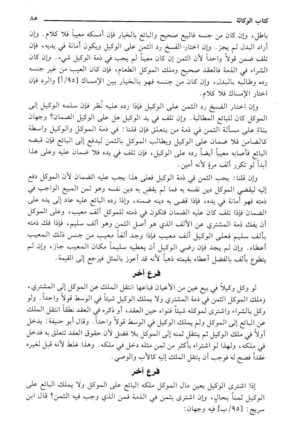 باطل، وإن كان من جنسه فالبيع صحيح والبائع بالخيار فإن أمسكه معيباً فلا كلام. وإن أراد البدل لم يجز. وان اختار: الفسخ رد الثمن على الوكيل ويكون أمانة في يديه، فإن تلف ضمن قولاً واحداً لأن الثمن إن كان معيباً لم يجب في ذمة الوكيل شيء. وإن كان الشراء في الذمة فالعقد صحيح وملك الموكل الطعام، فإن كان العيب من غير جنسه رده وطالبه بالبدل، وان كان من جنسه فهو بالخيار بين الإمساك [95/أ] والرد فإن اختار الإمساك فلا كلام.