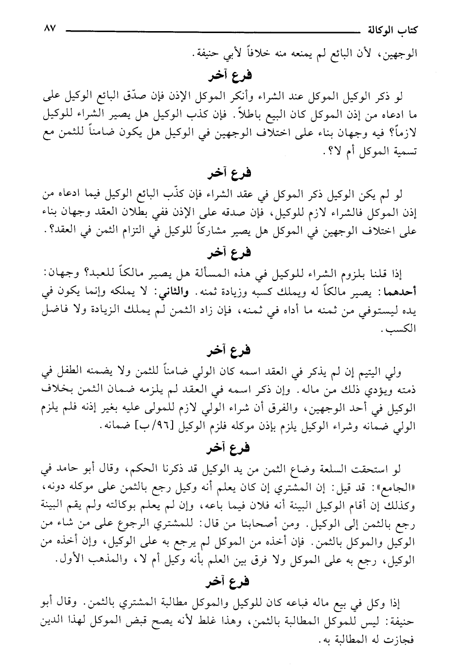 ولي اليتيم إن لم يذكر في العقد اسمه كان الولي ضامناً للثمن ولا يضمنه الطفل في ذمته ويؤدي ذلك من ماله. وإن ذكر اسمه في العقد لم يلزمه ضمان الثمن بخلاف الوكيل في أحد الوجهين، والفرق أن شراء الولي لازم للمولى عليه بغير إذنه فلم يلزم الولي ضمانه وشر اء الوكيل يلزم بإذن موكله فلزم الوكيل [96 /ب] ضمانه.