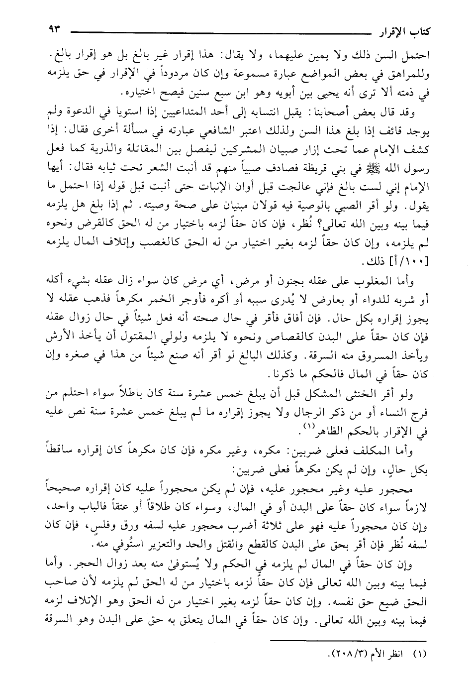 ولو أقر الخنثى المشكل قبل أن يبلغ خمس عشرة سنة كان باطلاً سواء احتلم من فرج النساء أو من ذكر الرجال ولا يجوز إقراره ما لم يبلغ خمس عشرة سنة نص عليه في الإقرار بالحكم الظاهر [(¬1)].
