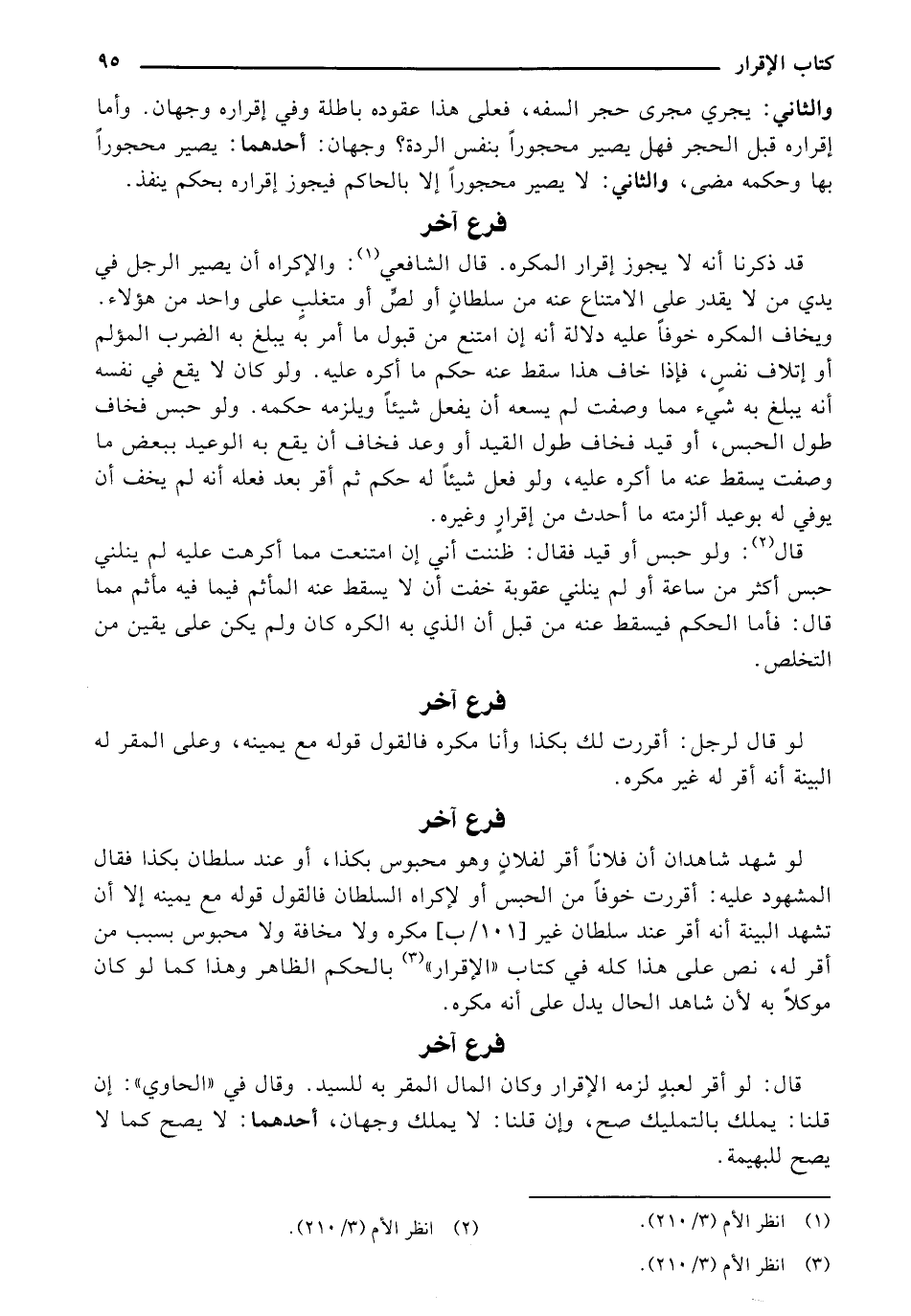 قد ذكرنا أنه لا يجوز إقرار المكره. قال الشافعي [(¬1)]: والإكراه أن يصير الرجل في يدي من لا يقدر على الامتناع عنه من سلطانٍ أو لصَّ أو متغلبٍ على واحد من هؤلاء. ويخاف المكره خوفاً عليه دلالة أنه إن امتنع من قبول ما أمر به يبلغ به الضرب المؤلم أو إتلاف نفسٍ، فإذا خاف هذا سقط عنه حكم ما أكره عليه. ولو كان لا يقع في نفسه أنه يبلغ به شيء مما وصفت لم يسعه أن يفعل شيئاً ويلزمه حكمه. ولو حبس فخاف الحبس، أو قيد فخاف طول القيد أو وعد فخاف أن يقع به الوعيد ببعض ما وصفت يسقط عنه ما أكره عليه، ولو فعل شيئاً له حكم ثم أقر بعد فعله أنه لم يخف أن يوفي له بوعيد ألزمته ما أحدث من إقرار وغيره.
