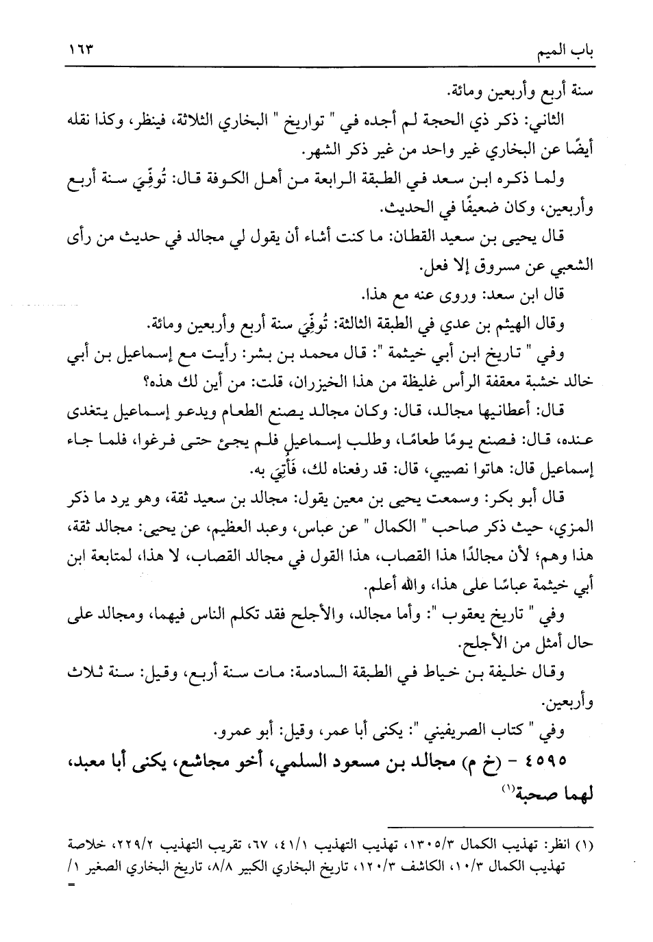قال أبو بكر: وسمعت يحيى بن معين يقول: مجالد بن سعيد ثقة، وهو يرد ما ذكر المزي، حيث ذكر صاحب "الكمال" عن عباس، وعبد العظيم، عن يحيى: مجالد ثقة، هذا وهم؛ لأن مجالدًا هذا القصاب، هذا القول في مجالد القصاب، لا هذا، لمتابعة ابن أبي خيثمة عباسًا على هذا، واللَّه أعلم.