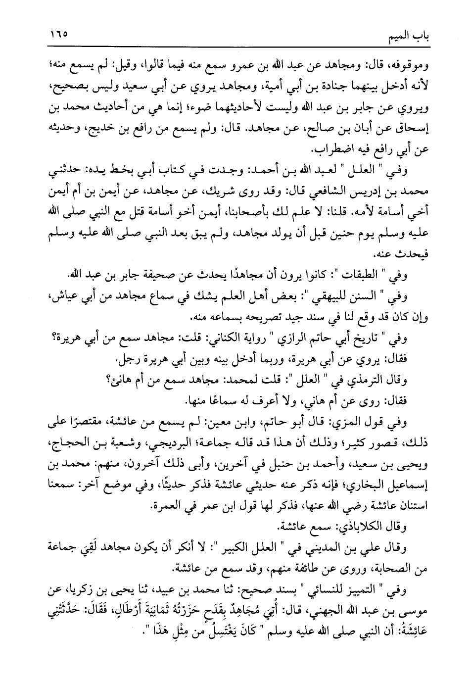 وموقوفه، قال: ومجاهد عن عبد اللَّه بن عمرو سمع منه فيما قالوا، وقيل: لم يسمع منه؛ لأنه أدخل بينهما جنادة بن أبي أمية، ومجاهد يروي عن أبي سعيد وليس بصحيح، ويروي عن جابر بن عبد اللَّه وليست لأحاديثهما ضوء، إنما هي من أحاديث محمد بن إسحاق عن أبان بن صالح، عن مجاهد. قال: ولم يسمع من رافع بن خديج، وحديثه عن أبي رافع فيه اضطراب.