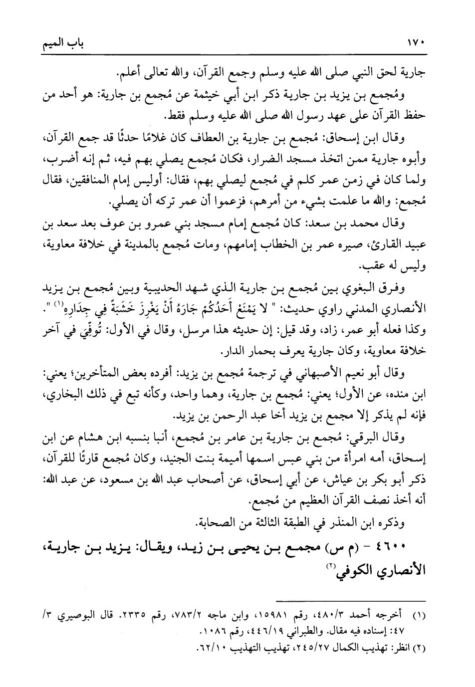 وقال أبو نعيم الأصبهاني في ترجمة مُجمع بن يزيد: أفرده بعض المتأخرين؛ يعني: ابن منده، عن الأول "يعني: مُجمع بن جارية، وهما واحد، وكأنه تبع في ذلك البخاري، فإنه لم يذكر إلا مجمع بن يزيد أخا عبد الرحمن بن يزيد.