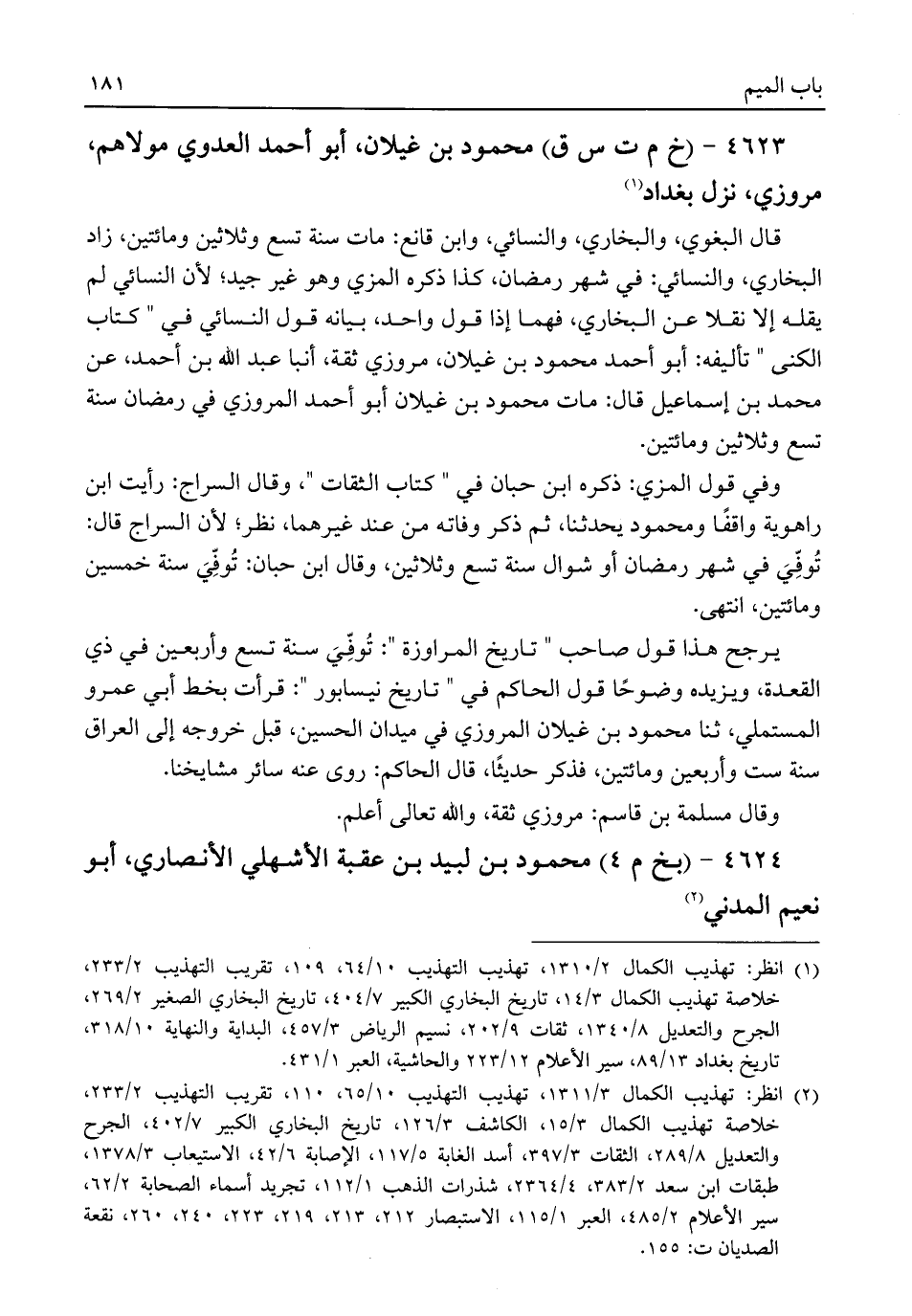 ٤٦٢٣ - (خ م ت س ق) محمود بن غيلان، أبو أحمد العدوي مولاهم، مروزي، نزل بغداد (¬١)