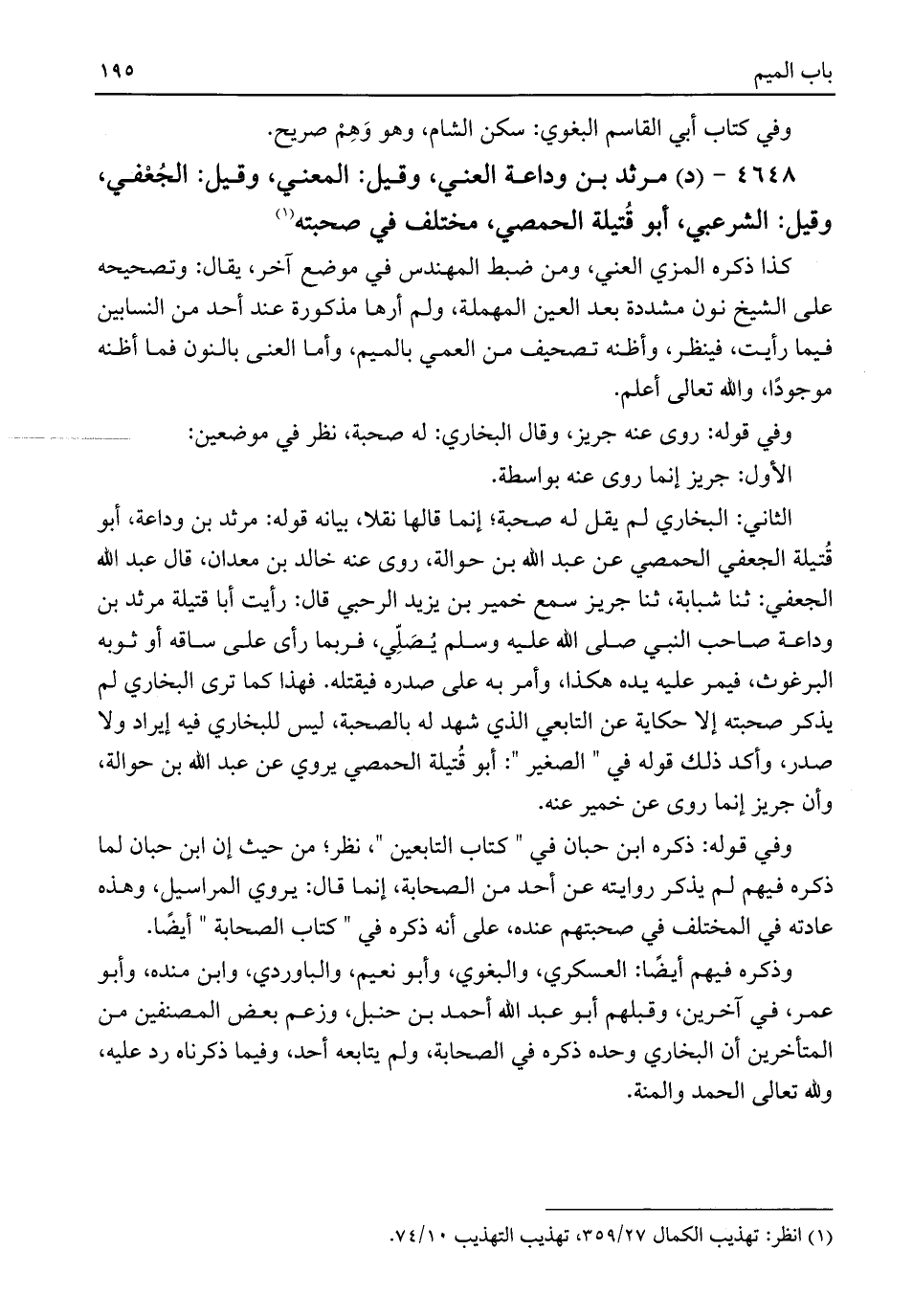 الثاني: البخاري لم يقل له صحبة؛ إنما قالها نقلا، بيانه قوله: مرثد بن وداعة، أبو قُتيلة الجعفي الحمصي عن عبد اللَّه بن حوالة، روى عنه خالد بن معدان، قال عبد اللَّه الجعفي: ثنا شبابة، ثنا جريز سمع خمير بن يزيد الرحبي قال: رأيت أبا قتيلة مرثد بن وداعة صاحب النبي صلى اللَّه عليه وسلم يُصَلِّي، فربما رأى على ساقه أو ثوبه البرغوث، فيمر عليه يده هكذا، وأمر به على صدره فيقتله. فهذا كما ترى البخاري لم يذكر صحبته إلا حكاية عن التابعي الذي شهد له بالصحبة، ليس للبخاري فيه إيراد ولا صدر، وأكد ذلك قوله في "الصغير": أبو قُتيلة الحمصي يروي عن عبد اللَّه بن حوالة، وأن جريز إنما روى عن خمير عنه.