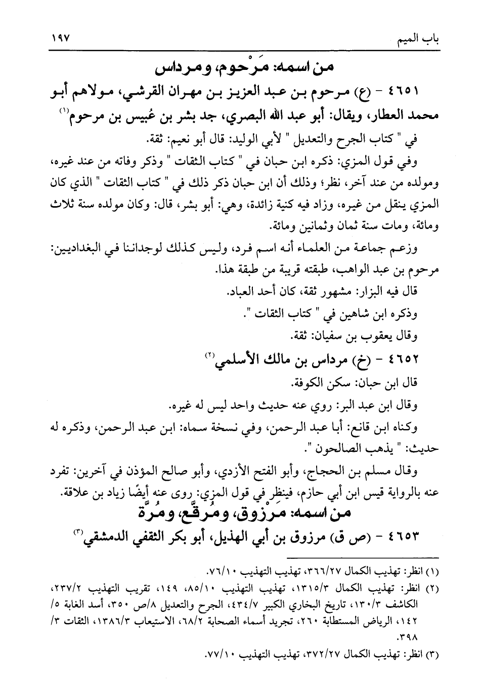 وزعم جماعة من العلماء أنه اسم فرد، وليس كذلك لوجداننا في البغداديين: مرحوم بن عبد الواهب، طبقته قريبة من طبقة هذا.
