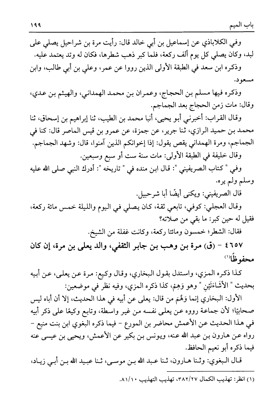 وفي الكلاباذي عن إسماعيل بن أبي خالد قال: رأيت مرة بن شراحيل يصلي على لبد، وكان يصلي كل يوم ألف ركعة، فلما كبر ذهب شطرها، فكان له وتد يعتمد عليه.