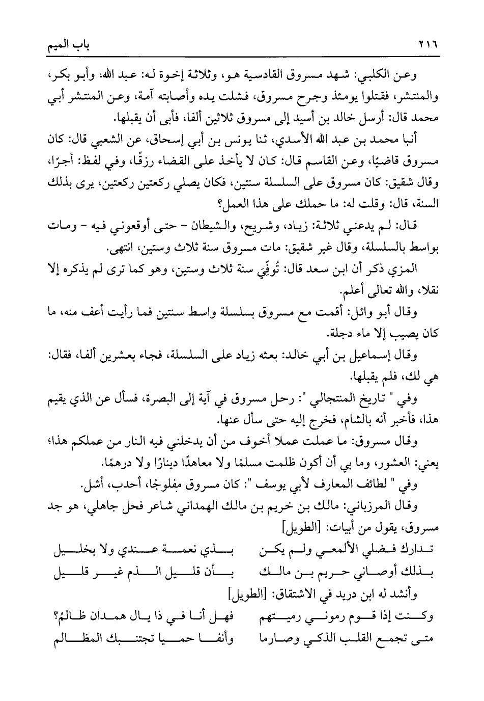 وقال المرزباني: مالك بن خريم بن مالك الهمداني شاعر فحل جاهلي، هو جد مسروق، يقول من أبيات: [الطويل]