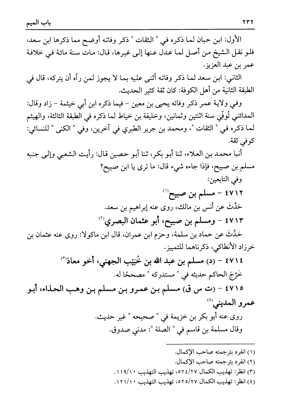 الأول: ابن حبان لما ذكره في "الثقات" ذكر وفاته أوضح مما ذكرها ابن سعد، فلو نقل الشيخ من أصل لما عدل عنها إلى غيرها، قال: مات سنة مائة في خلافة عمر بن عبد العزيز.