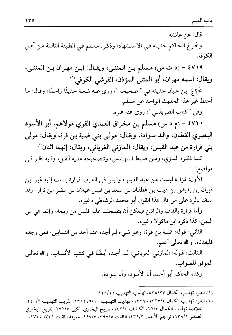 ٤٧٢٠ - (م د س) مسلم بن مخراق العبدي القري مولاهم، أبو الأسود البصري القطان، والد سوادة، ويقال: مولى بني ضبة بن قرة، ويقال: مولى بني فزارة من عبد القيس، ويقال: المازني العُرياني، ويقال: إنهما اثنان (¬٢)