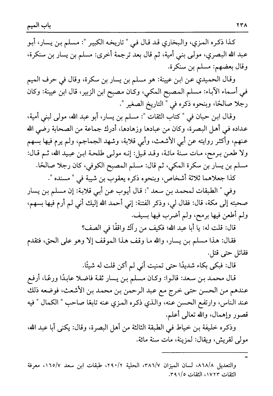 وقال ابن حبان في "كتاب الثقات": مسلم بن يسار، أبو عبد اللَّه، مولى لبني أمية، عداده في أهل البصرة، وكان من عبادها وزهادها، أدرك جماعة من الصحابة رضي اللَّه عنهم، وأكثر روايته عن أبي الأشعث، وأبي قلابة، وشهد الجماجم، ولم يرم فيها بسهم ولا طعن برمح، مات سنة مائة، وقد قيل: إنه مولى طلحة ابن عبيد اللَّه، ثم قال: مسلم بن يسار بن سكرة المكي، ثم قال: مسلم المصبح الكوفي، كان رجلا صالحًا.