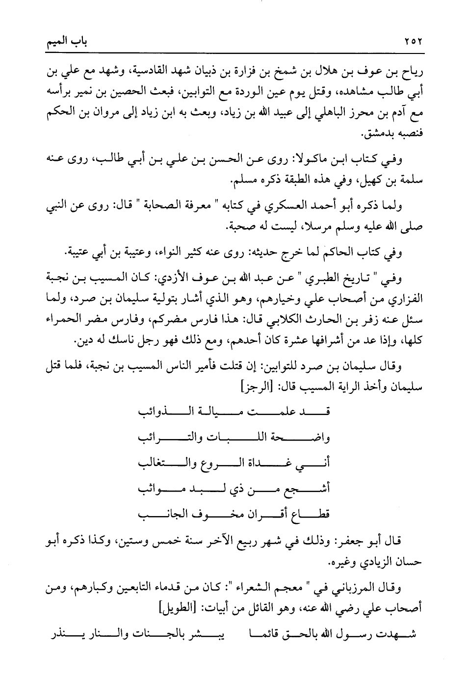 وفي "تاريخ الطبري" عن عبد اللَّه بن عوف الأزدي: كان المسيب بن نجبة الفزاري من أصحاب علي وخيارهم، وهو الذي أشار بتولية سليمان بن صرد، ولما سئل عنه زفر بن الحارث الكلابي قال: هذا فارس مضركم، وفارس مضر الحمراء كلها، وإذا عد من أشرافها عشرة كان أحدهم، ومع ذلك فهو رجل ناسك له دين.