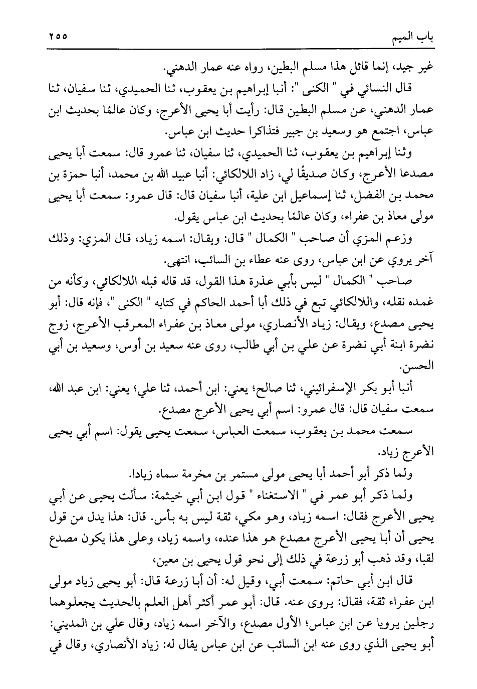 ولما ذكر أبو عمر في "الاستغناء" قول ابن أبي خيثمة: سألت يحيى عن أبي يحيى الأعرج فقال: اسمه زياد، وهو مكي، ثقة ليس به بأس. قال: هذا يدل من قول يحيى أن أبا يحيى الأعرج مصدع هو هذا عنده، واسمه زياد، وعلى هذا يكون مصدع لقبا، وقد ذهب أبو زرعة في ذلك إلى نحو قول يحيى بن معين.