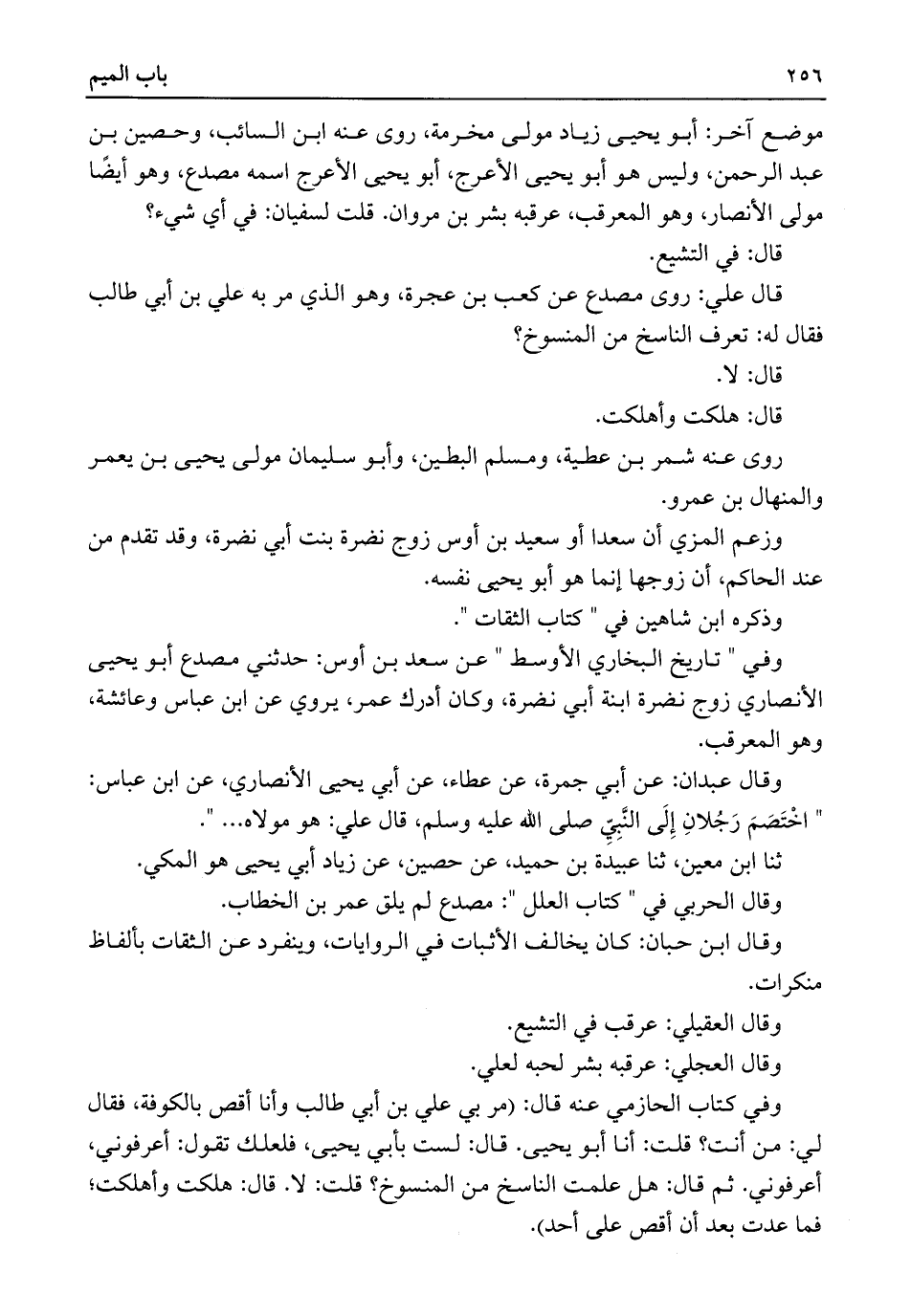 موضع آخر: أبو يحيى زياد مولى مخرمة، روى عنه ابن السائب، وحصين بن عبد الرحمن، وليس هو أبو يحيى الأعرج، أبو يحيى الأعرج اسمه مصدع، وهو أيضًا مولى الأنصار، وهو المعرقب، عرقبه بشر بن مروان. قلت لسفيان: في أي شيء؟
