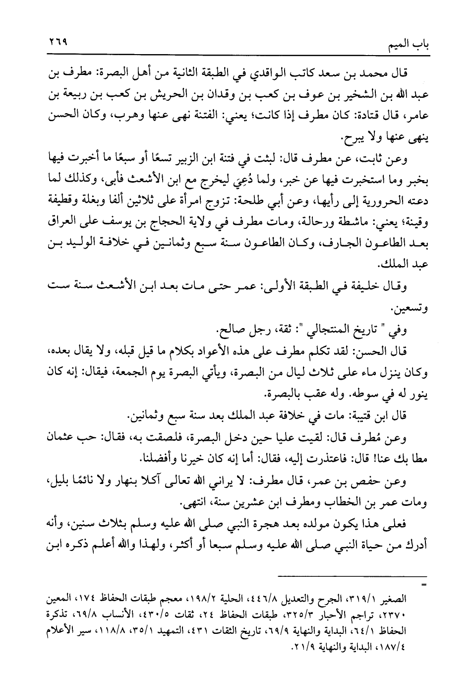 قال محمد بن سعد كاتب الواقدي في الطبقة الثانية من أهل البصرة: مطرف بن عبد اللَّه بن الشخير بن عوف بن كعب بن وقدان بن الحريش بن كعب بن ربيعة بن عامر، قال قتادة: كان مطرف إذا كانت؛ يعني: الفتنة نهى عنها وهرب، وكان الحسن ينهى عنها ولا يبرح.