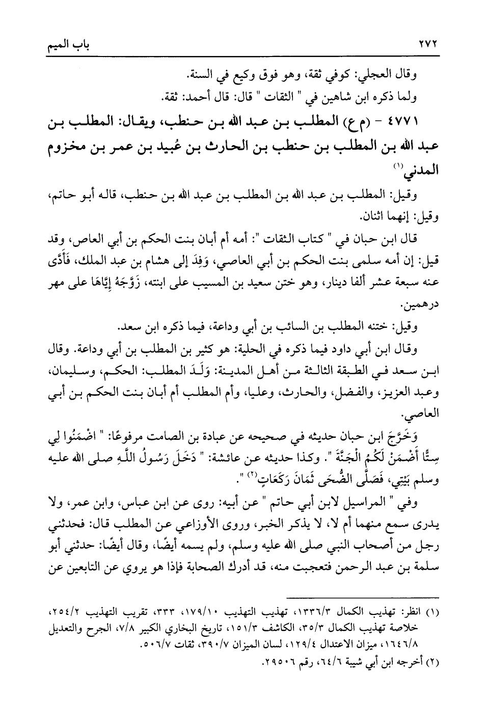 ٤٧٧١ - (م ع) المطلب بن عبد اللَّه بن حنطب، ويقال: المطلب بن عبد اللَّه بن المطلب بن حنطب بن الحارث بن عُبيد بن عمر بن مخزوم المدني (¬١)