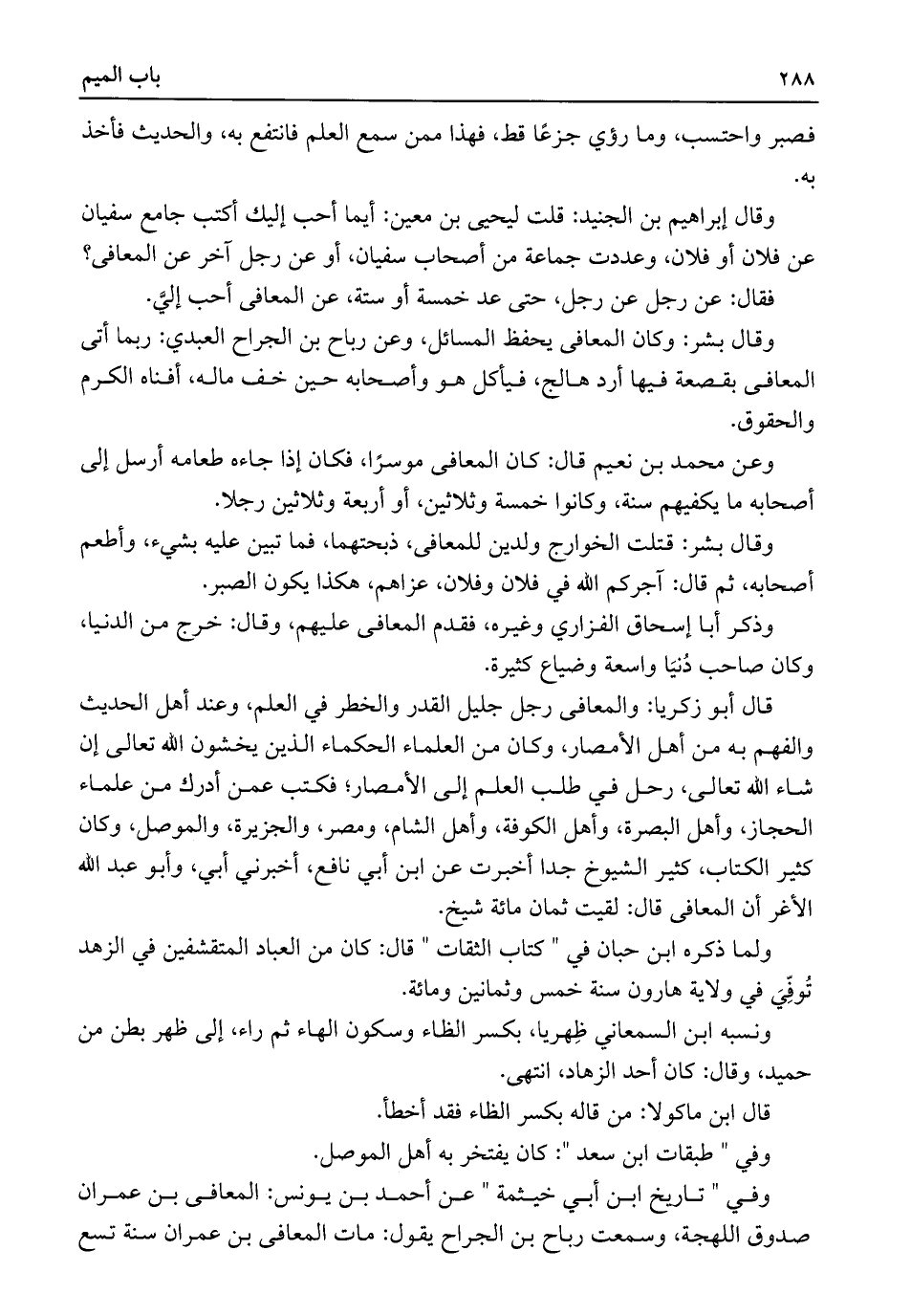 وقال إبراهيم بن الجنيد: قلت ليحيى بن معين: أيما أحب إليك أكتب جامع سفيان عن فلان أو فلان، وعددت جماعة من أصحاب سفيان، أو عن رجل آخر عن المعافى؟