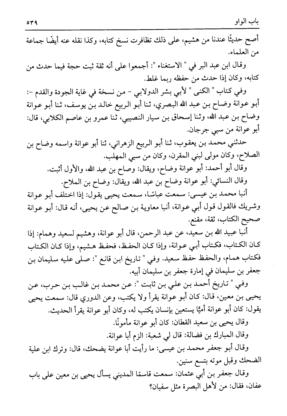 أنبا محمد بن عيسى: سمعت عباسًا، سمعت يحيى يقول: إذا اختلف أبو عوانة وشريك فالقول قول أبي عوانة، أنبا معاوية بن صالح عن يحيى، أنه قال: أبو عوانة صحيح الكتاب، ثقة، مقنع.
