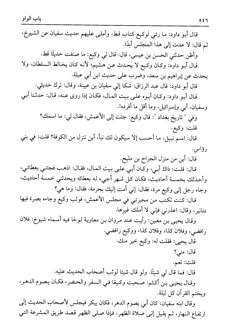 قال أبو داود: ما رئي لوكيع كتاب قط، وأملى عليهم حديث سفيان عن الشيوخ، ثم قال: لا عدت إلى هذا المجلس أبدًا.