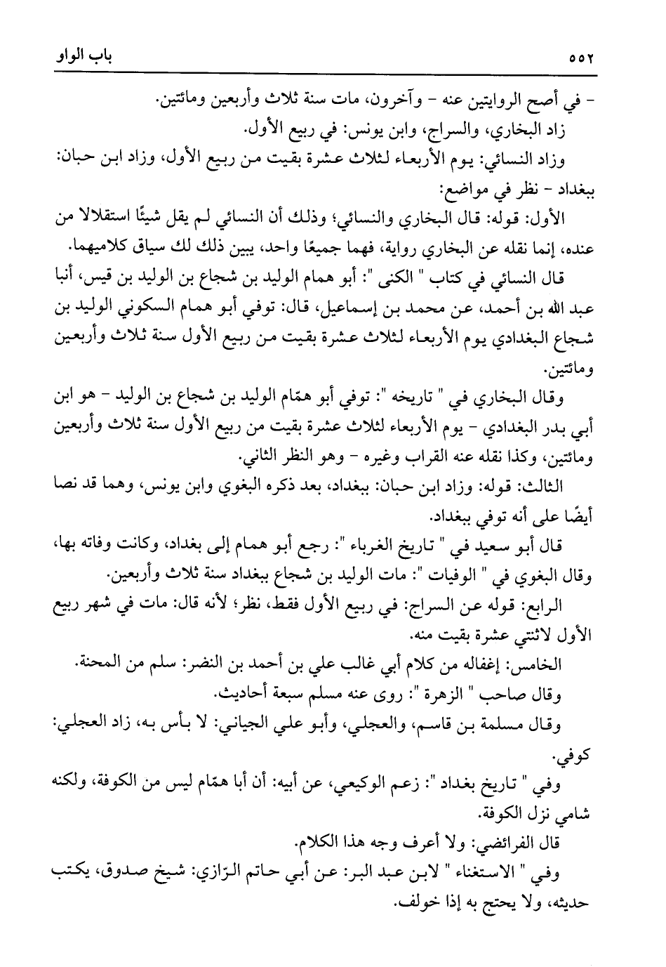 وزاد النسائي: يوم الأربعاء لثلاث عشرة بقيت من ربيع الأول، وزاد ابن حبان: ببغداد - نظر في مواضع:
