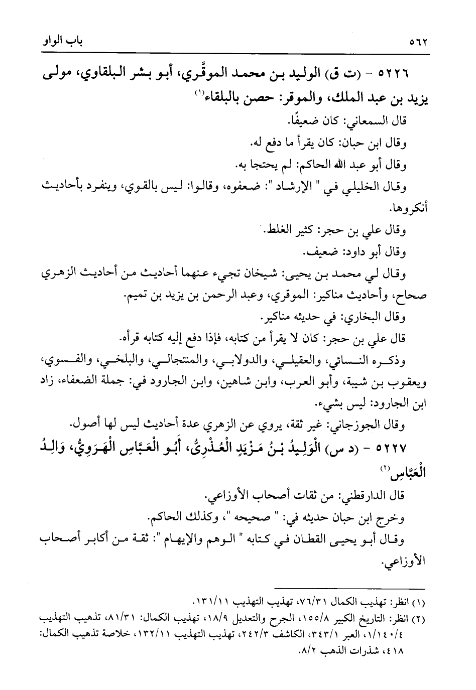 ٥٢٢٦ - (ت ق) الوليد بن محمد الموقَّري، أبو بشر البلقاوي، مولى يزيد بن عبد الملك، والموقر: حصن بالبلقاء (¬١)