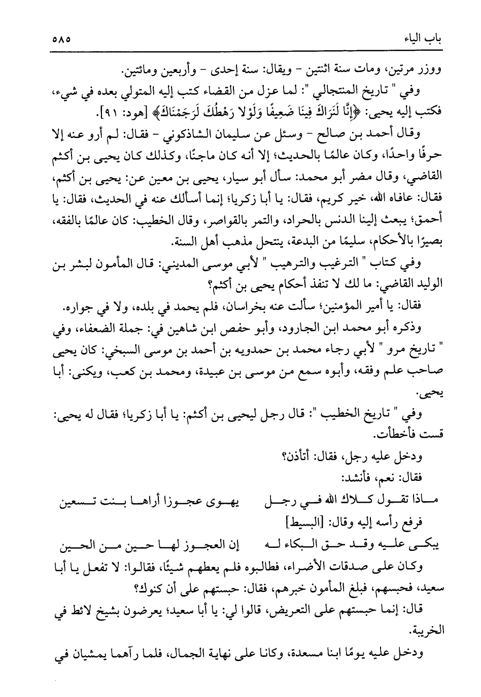وفي "تاريخ المنتجالي": لما عزل من القضاء كتب إليه المتولي بعده في شيء، فكتب إليه يحيى: {وَإِنَّا لَنَرَاكَ فِينَا ضَعِيفًا وَلَوْلَا رَهْطُكَ لَرَجَمْنَاكَ} [هود: ٩١].