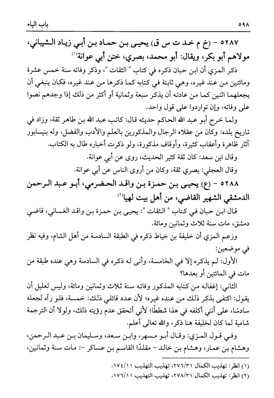 الثاني: إغفاله من كتابه المذكور وفاته سنة ثلاث وثمانين ومائة، وليس لعليل أن يقول: اكتفى بذكر ذلك من عنده غيره؛ لأن عدد قائلي ذلك: خمسة، فلو رآه لجعله سادسًا، على أنني أكلفه في هذا شططًا؛ لأني أتحقق عدم رؤيته ذلك، ولولا أن الترجمة شامية لما كان لخليفة هنا ذكر، واللَّه تعالى أعلم.