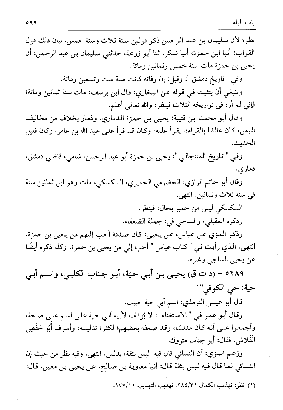 نظر؛ لأن سليمان بن عبد الرحمن ذكر قولين سنة ثلاث وسنة خمس. بيان ذلك قول القراب: أنبا ابن حمزة، أنبا شكر، ثنا أبو زرعة، حدثني سليمان بن عبد الرحمن: أن يحيى بن حمزة مات سنة خمس وثمانين ومائة.