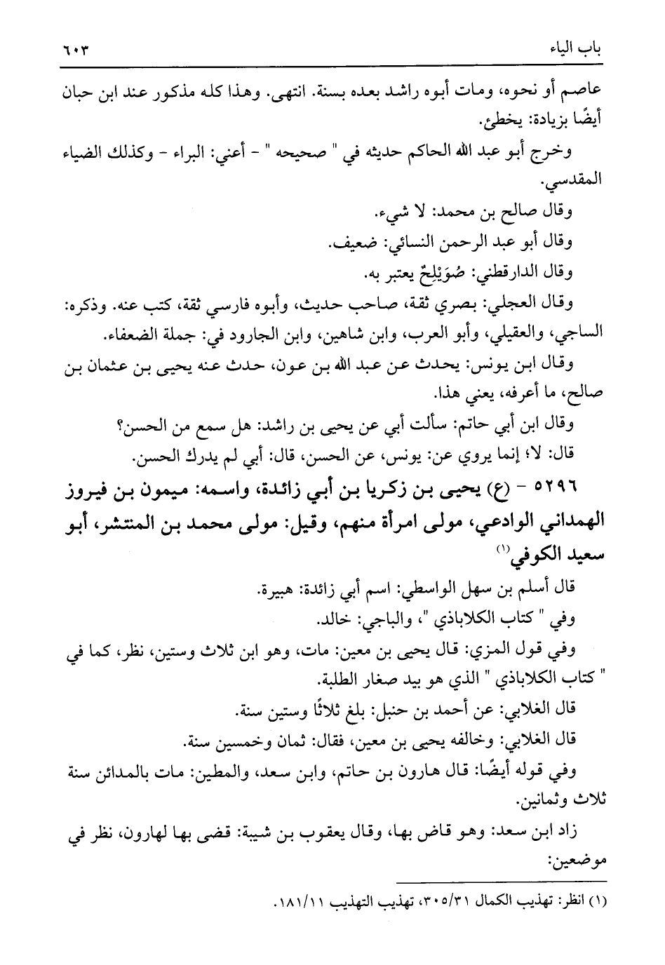 ٥٢٩٦ - (ع) يحيى بن زكريا بن أبي زائدة، واسمه: ميمون بن فيروز الهمداني الوادعي، مولى امرأة منهم، وقيل: مولى محمد بن المنتشر، أبو سعيد الكوفي (¬١)