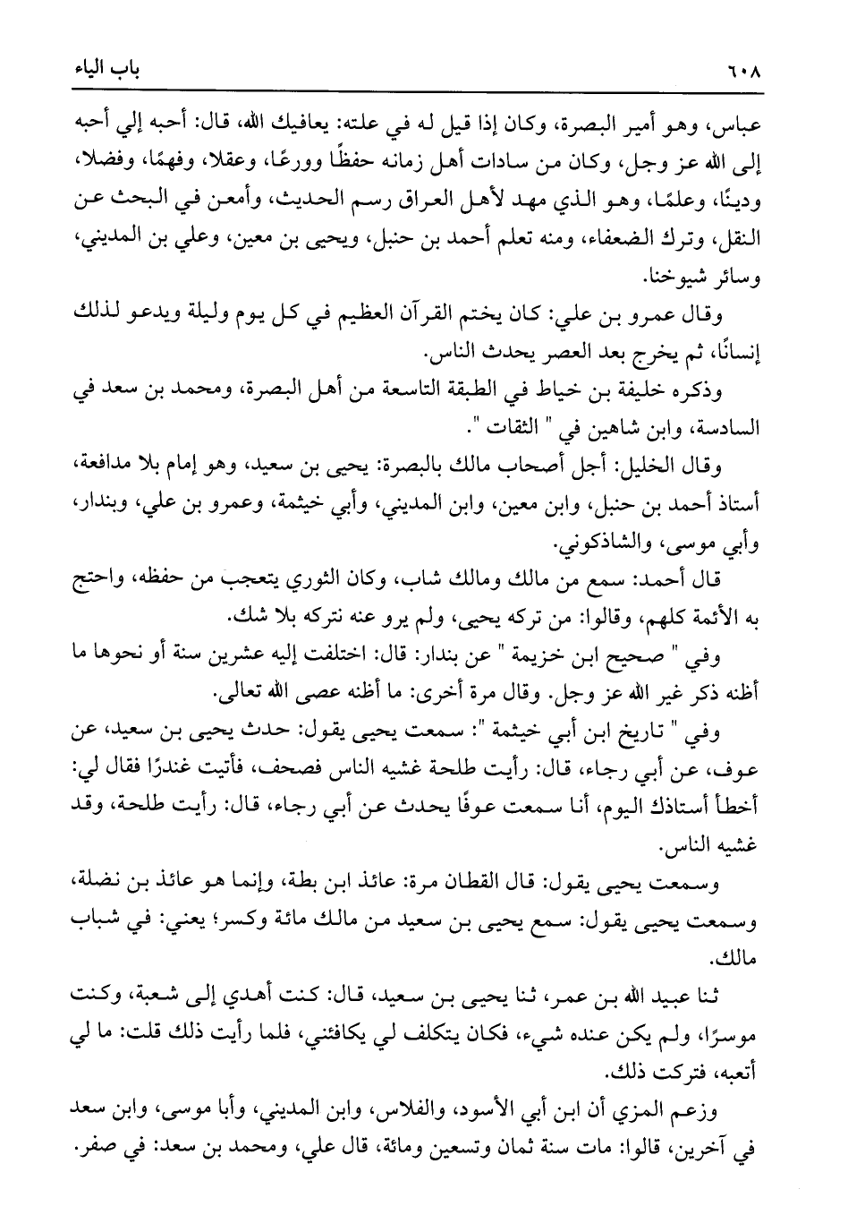 عباس، وهو أمير البصرة، وكان إذا قيل له في علته: يعافيك اللَّه، قال: أحبه إلي أحبه إلى اللَّه عز وجل، وكان من سادات أهل زمانه حفظًا وورعًا، وعقلا، وفهمًا، وفضلا، ودينًا، وعلمًا، وهو الذي مهد لأهل العراق رسم الحديث، وأمعن في البحث عن النقل، وترك الضعفاء، ومنه تعلم أحمد بن حنبل، ويحيى بن معين، وعلي بن المديني، وسائر شيوخنا.