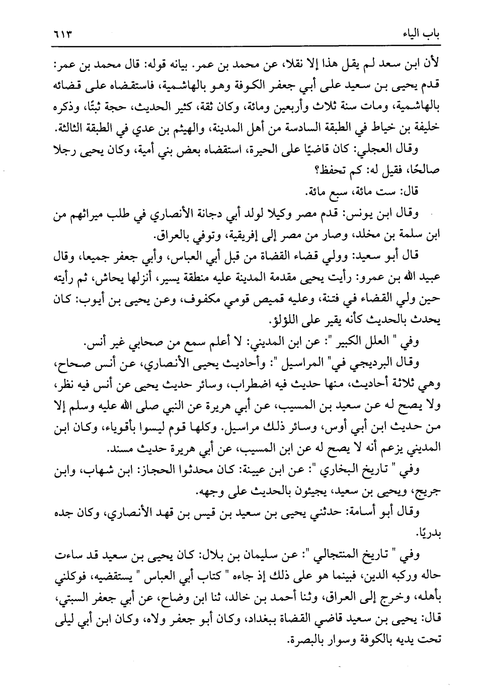 لأن ابن سعد لم يقل هذا إلا نقلا، عن محمد بن عمر. بيانه قوله: قال محمد بن عمر: قدم يحيى بن سعيد على أبي جعفر الكوفة وهو بالهاشمية، فاستقضاه على قضائه بالهاشمية، ومات سنة ثلاث وأربعين ومائة، وكان ثقة، كثير الحديث، حجة ثبتًا، وذكره خليفة بن خياط في الطبقة السادسة من أهل المدينة، والهيثم بن عدي في الطبقة الثالثة.