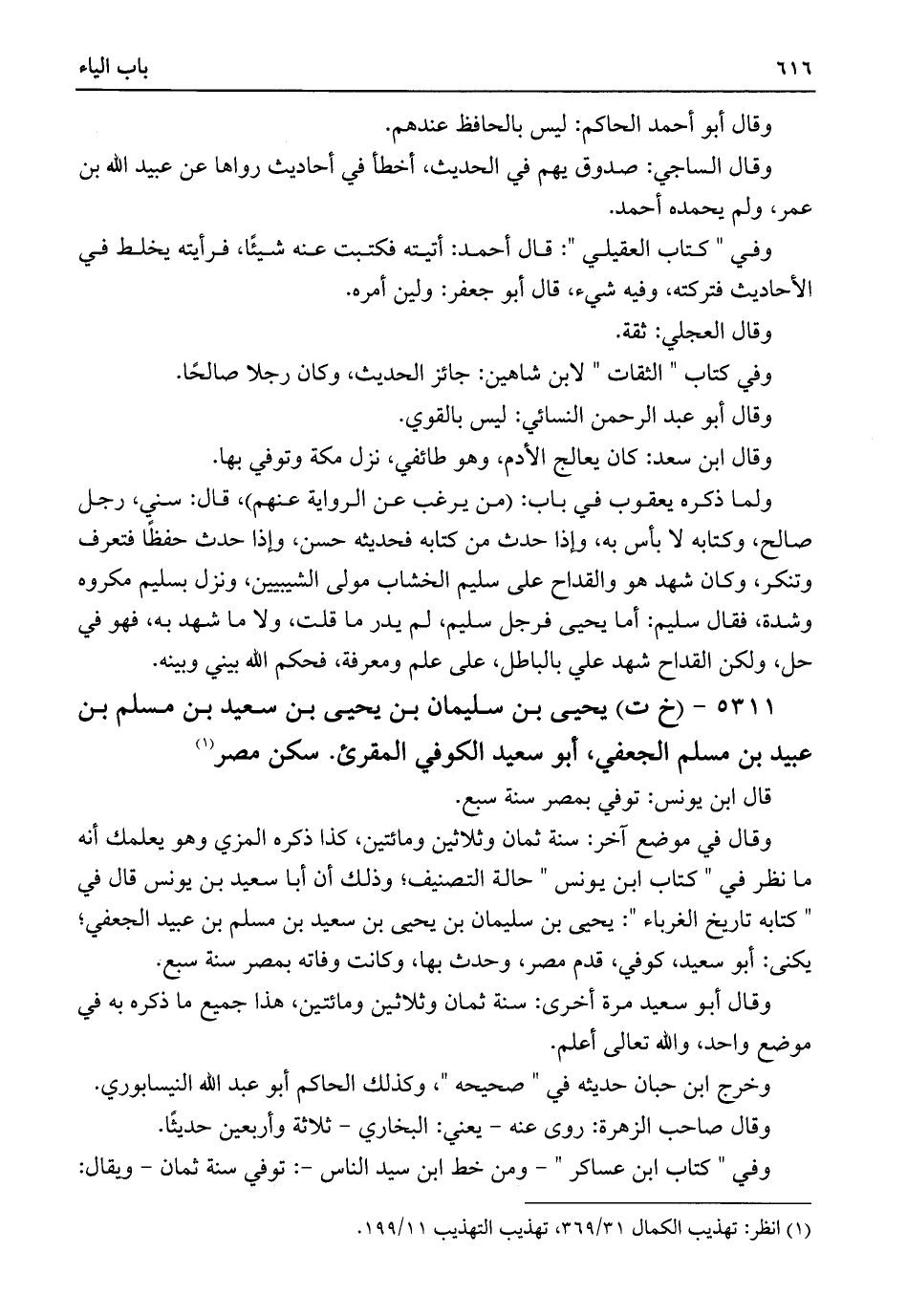 ٥٣١١ - (خ ت) يحيى بن سليمان بن يحيى بن سعيد بن مسلم بن عبيد بن مسلم الجعفي، أبو سعيد الكوفي المقرئ. سكن مصر (¬١)