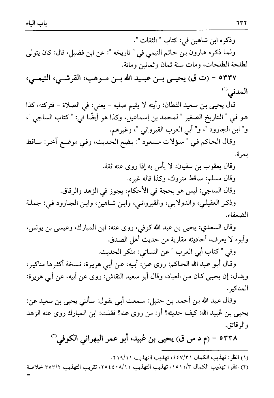 وقال أبو عبد اللَّه الحاكم: روى عن: أبيه، عن أبي هريرة، نسخة أكثرها مناكير، ويقال: إن يحيى كان من العباد، وقال أبو سعيد النقاش: روى عن أبيه، عن أبي هريرة: المناكير.