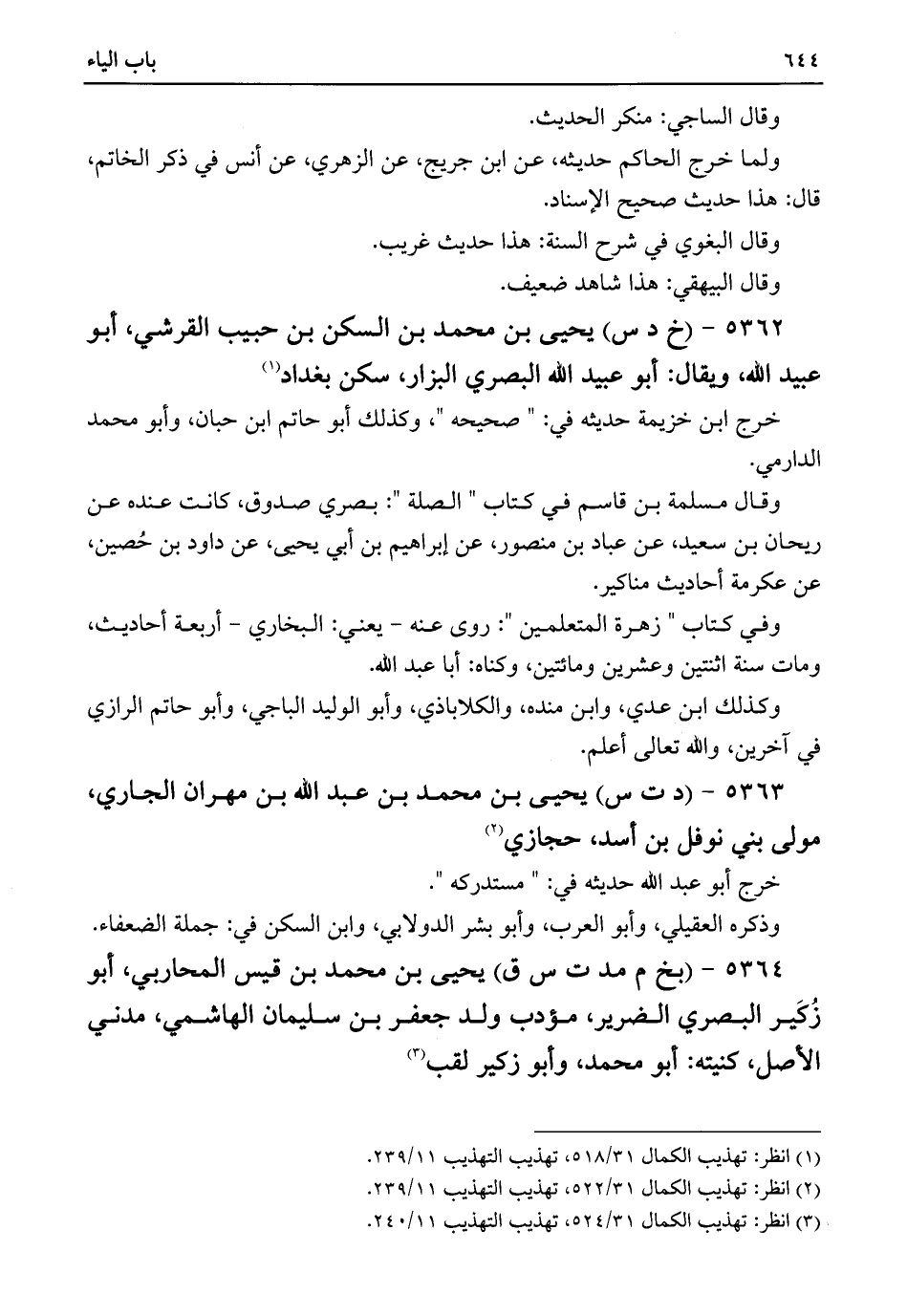 ٥٣٦٤ - (بخ م مد ت س ق) يحيى بن محمد بن قيس المحاربي، أبو زُكَير البصري الضرير، مؤدب ولد جعفر بن سليمان الهاشمي، مدني الأصل، كنيته: أبو محمد، وأبو زكير لقب (¬٣)