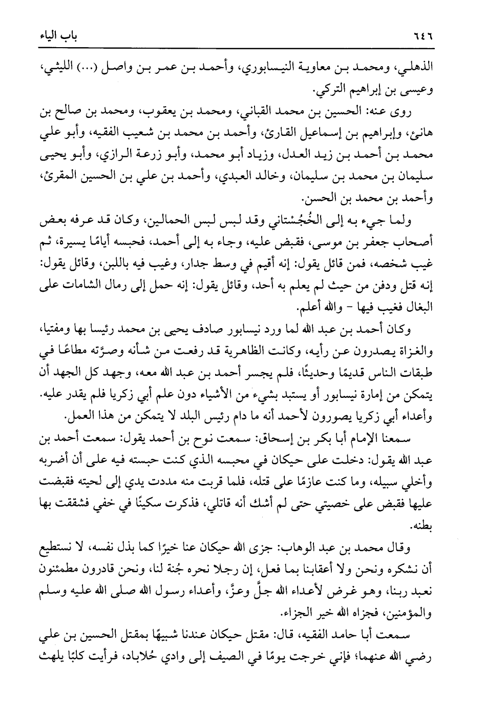 سمعنا الإمام أبا بكر بن إسحاق: سمعت نوح بن أحمد يقول: سمعت أحمد بن عبد اللَّه يقول: دخلت على حيكان في محبسه الذي كنت حبسته فيه على أن أضربه وأخلي سبيله، وما كنت عازمًا على قتله، فلما قربت منه مددت يدي إلى لحيته فقبضت عليها فقبض على خصيتي حتى لم أشك أنه قاتلي، فذكرت سكينًا في خفي فشققت بها بطنه.